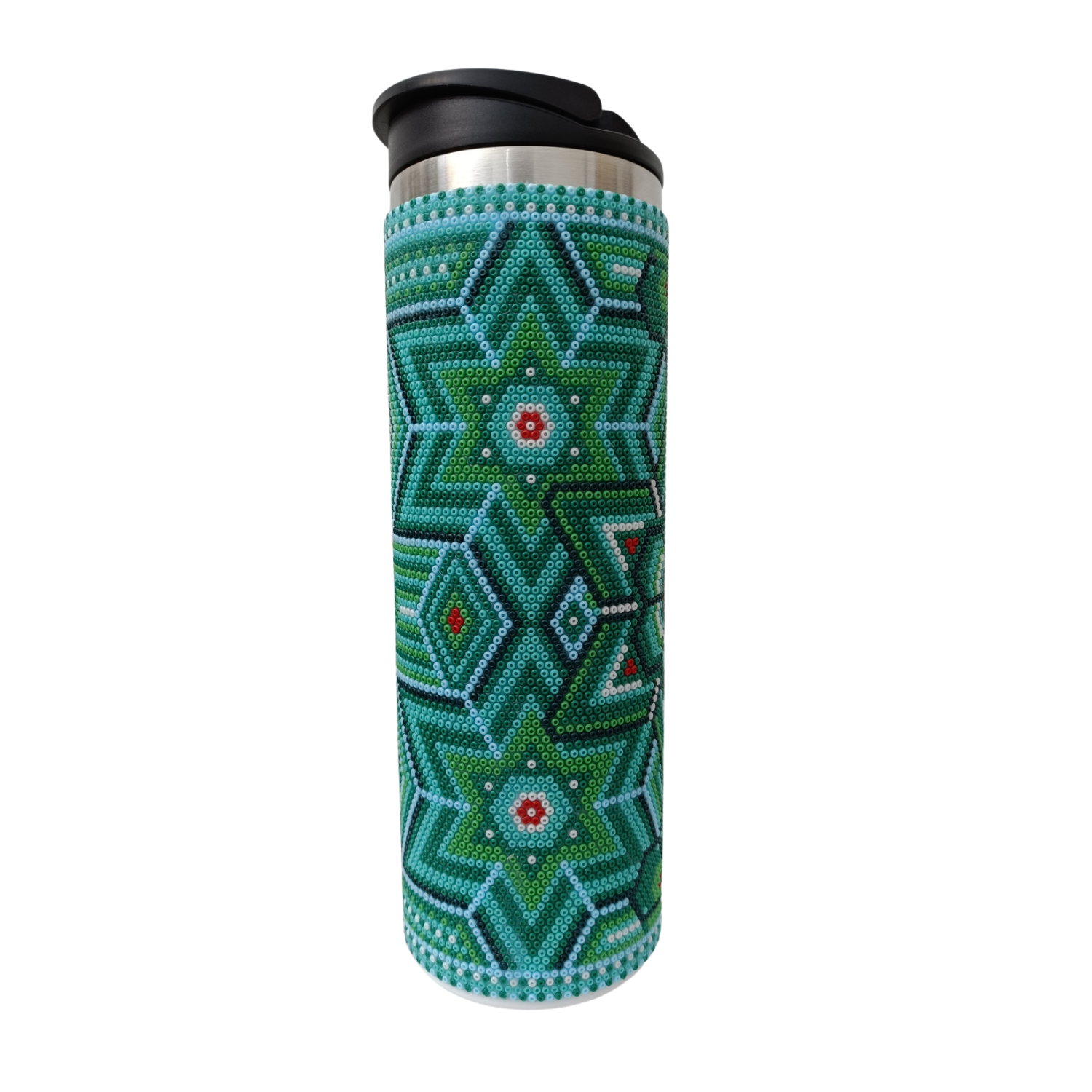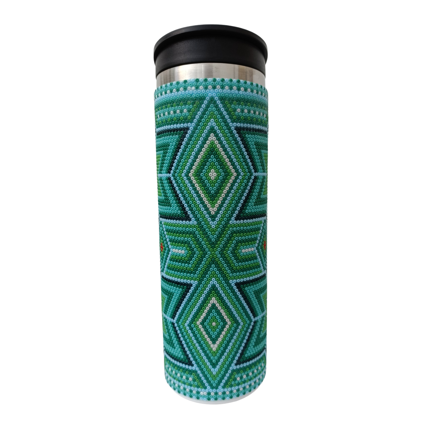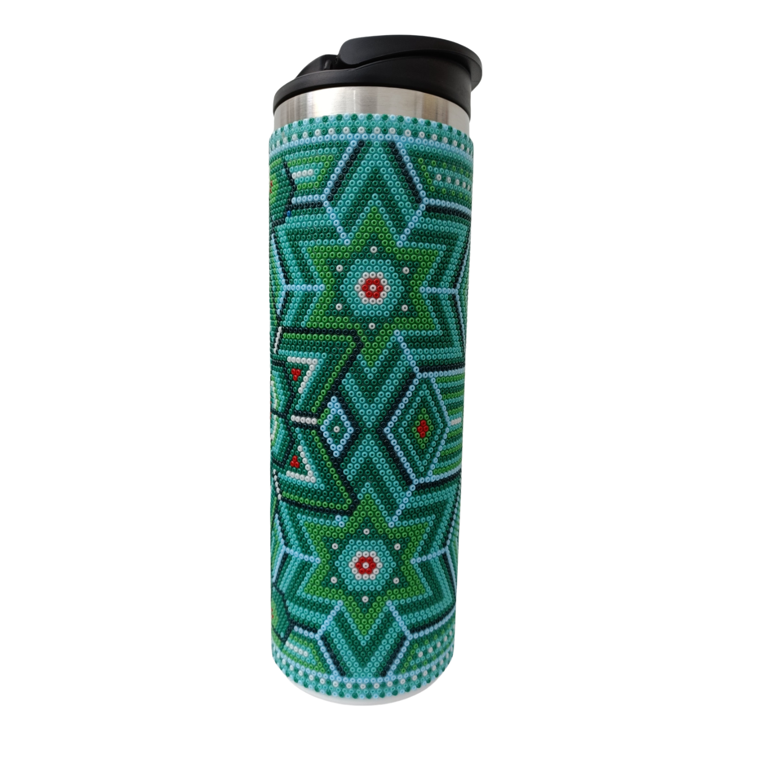 Elaborado en chaquira incrustada con pegamento epóxico de alta dureza, puede lavarlo con agua sin problema, la chaquira se mantiene adherida a lo largo del tiempo.